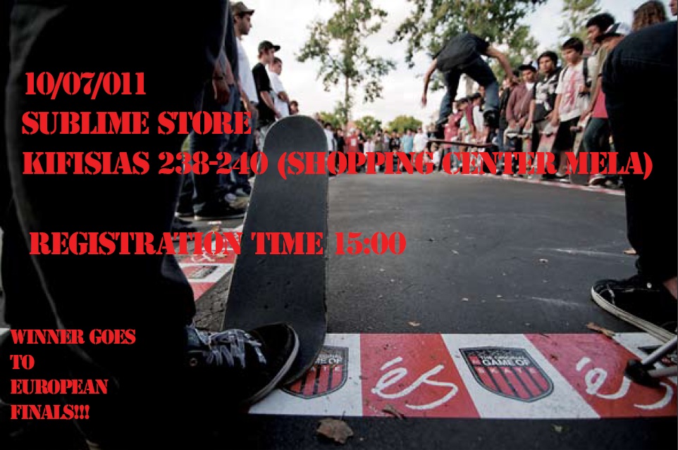 Την Κυριακή 10 Ιουλιου 2011 θα πραγματοποιηθεί το ES game of S.K.A.T.E. στον αίθριο χώρο του εμπορικού κέντρου Μελά, εξω ακριβώς απο το καταστημα Sublime στην Κηφησιά. Οι εγγραφές ξεκινάνε στις 15:00 και το game of S.K.A.T.E. στις 16:00. To contest είναι μόνο για sponsored skaters αλλα θα υπάρξουν οποσδήποτε και κάποιες εξαιρέσεις για καποιους καλούς unsponsored skaters.