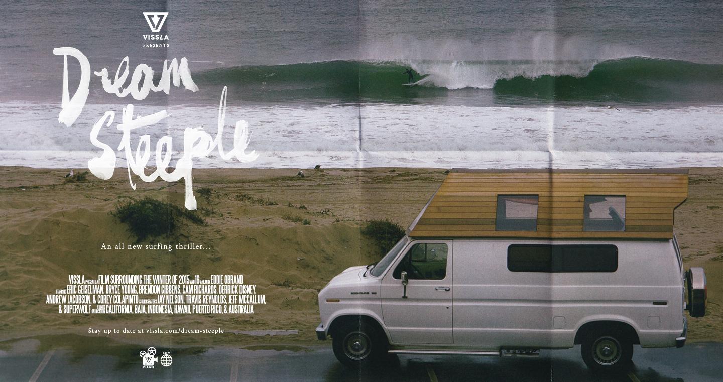 Dream Steeple ονομάζεται το νέο surf film της Vissla και είναι βασισμένο στο ημερολόγιο ένος “road-trip” στην δυτική ακτή της Αμερικής! Εμπνευσμένο από το ποιοτικό surf που δημιούργησε το φαινόμενο el-nino στον ειρηνικό ωκεανό το χειμώνα του 2016... με τους Eric Geiselman, Bryce Young, Brendon Gibbens, Cam Richards και Derrick Disney.Παγκόσμια πρεμιέρα στης 9 Ιουνίου...!